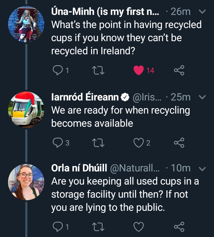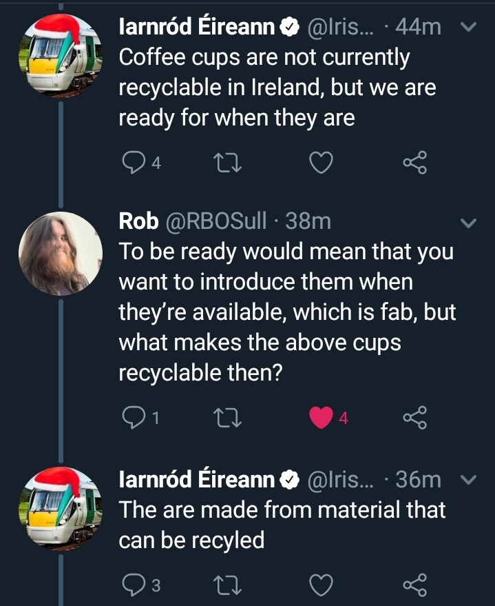 But disposable cups cannot be recycled in Ireland, it was pointed out. No, Iarnród Eireann admitted, but it is possible to recycle these materials and we are ready when that technology comes to Ireland.