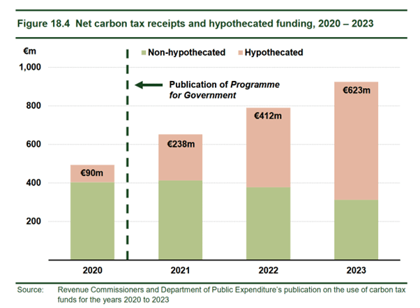 On my website I always put a text version of every episode up, but this one in particular has graphs that help illustrate some of what I’m saying. The report is far too detailed for me to read aloud to you here, but fundamentally hundreds of millions of euro from the carbon tax annually goes unspent as part of the ringfenced programmes and is surrendered back to the Exchequer.