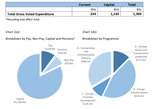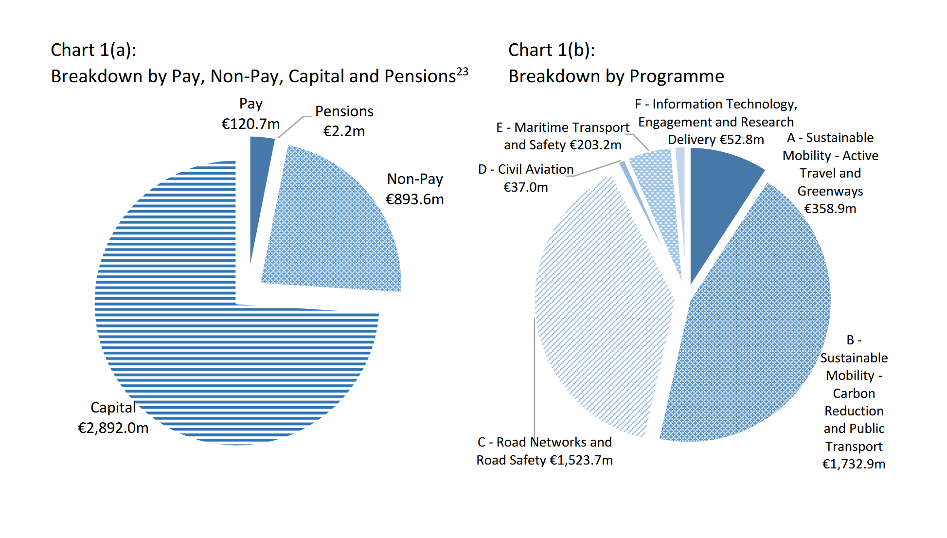 A good example to use is the Department of Transport. The expenditure ceiling for Transport is 3.9b euro, of which just over 1b is current expenditure and just over 2.89b is capital. It makes sense that a department dealing primarily with public infrastructure would lean heavily towards capital expenditure in its budget. There are six programmes titled A to F described under transport and each is given its own allocation of funds. The two largest are Programme B Carbon Reduction and Public Transport which is allocated €1.7b and Programme C Road Networks and Road Safety with €1.5b. Combined public transport and roads make up 83% of the Transport budget, which also makes sense. The other four programmes that make up the remaining 17% are active travel and greenways, civil aviation, Maritime Transport and Safety and Information Technology. Each of the programmes has a small further breakdown paragraph of text but usually figures aren’t applied here.