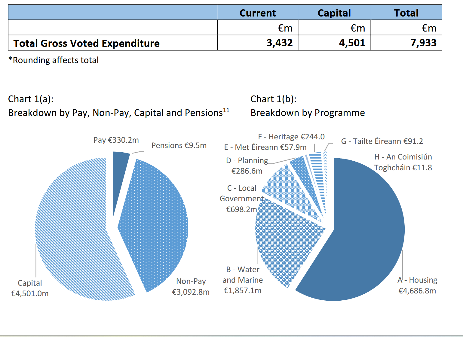 Obviously, the bulk of this departments €7.9b is allocated to housing, but the pie chart breakdown of funding on page 108 shows €1.86b for water and the marine and €244m for heritage.