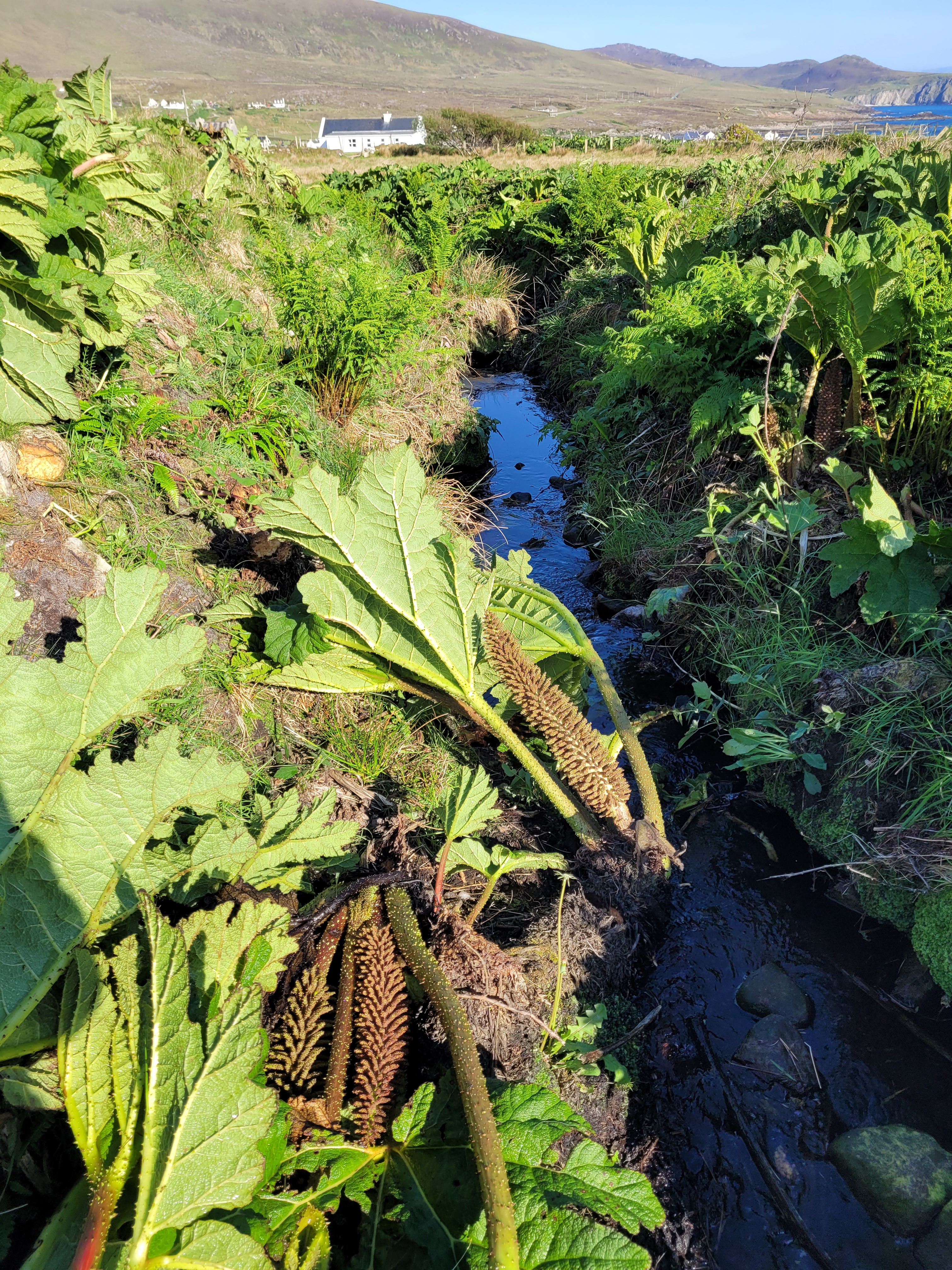 The main thing damaging this old ditch and the potential path is an invasive species common in the west of Ireland called gunnera. It is also referred to as giant rhubarb because of the shape of the leaves. Its seeds spread very effectively in water so in landscapes like the west of Ireland, with a high water table and lots of small streams, it becomes invasive quickly. It can be hard to remove and resistant to herbicide. Even if it was more effective, using herbicide is risky since its often on water courses. Contamination is very easy.